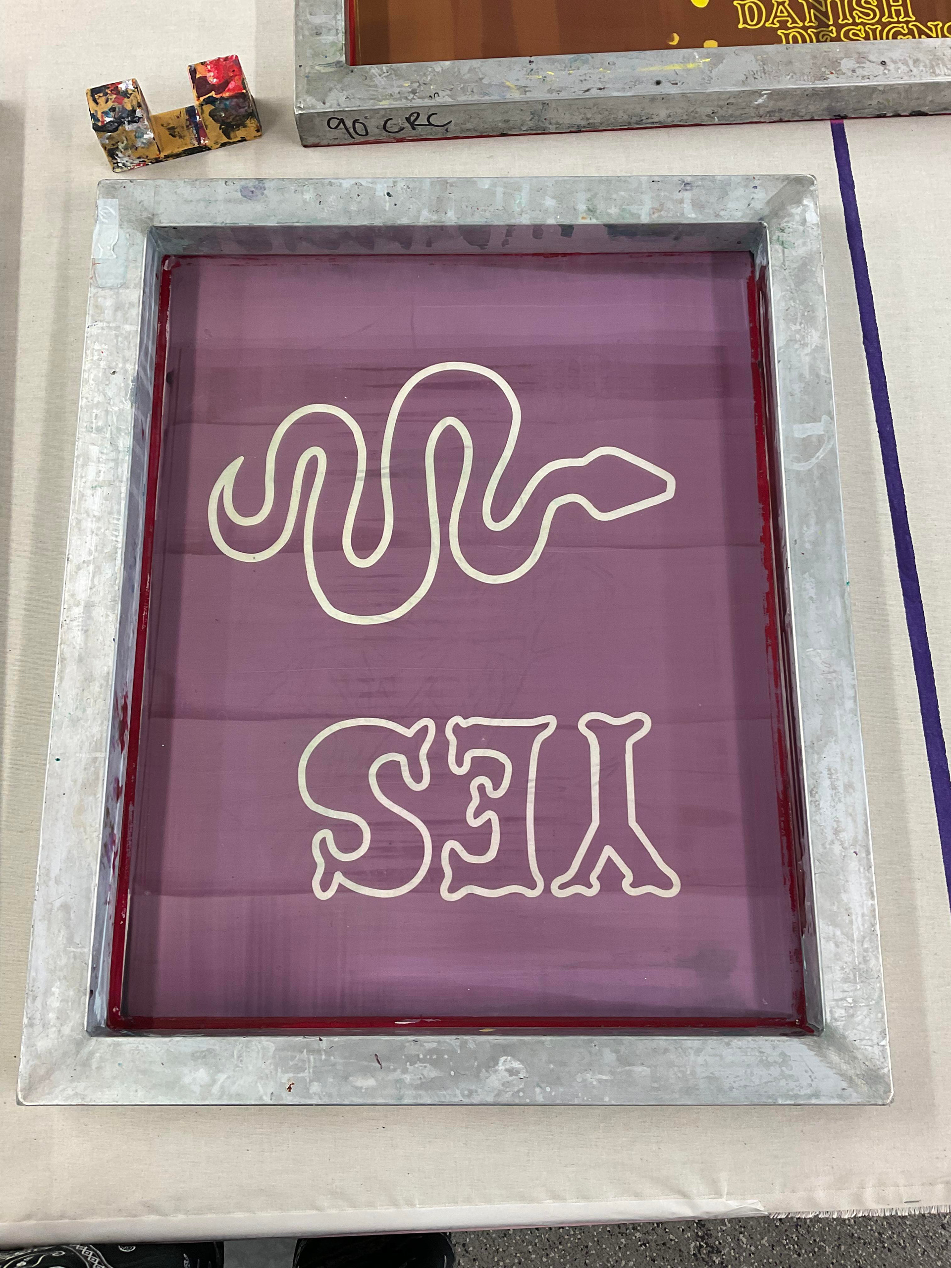 The images to the left depict the mesh screens, which are a variety of sizes in order to accommodate the designs and ensure correct orientations. Some screens were more expansive than others; I made this decision based on the design intention—one centered on a T-shirt, while the other spanned the entirety of the garment, resembling a full-sized print. The rationale behind this will become clearer when I present mock-ups of the anticipated outcome.